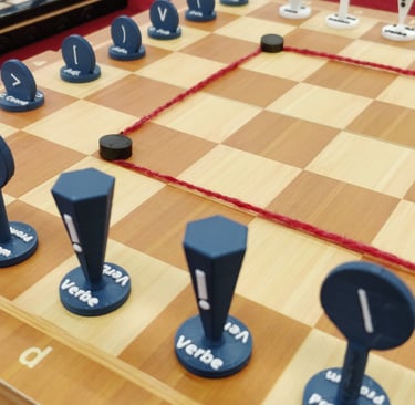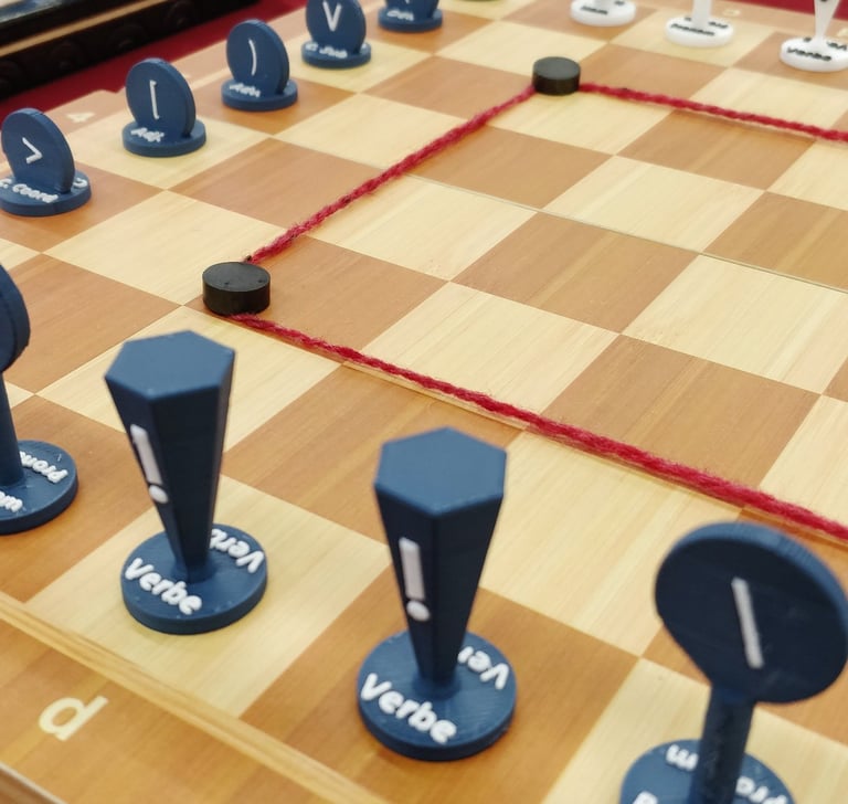 A tour de rôle, chaque joueur déplace une pièce de case en case en suivant la stratégie de son choix : éliminer les pièces adverses et risquer le match nul ou chercher à les utiliser à son avantage en les intégrant à sa propre phrase pour gagner.